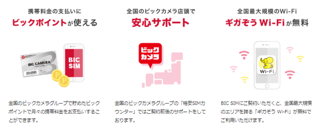 お得な料金プランに加え、BIC SIMならBIC SIMユーザー限定の特典、サービスが受けられます。
