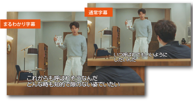 「まるわかり字幕」とは、劇中の言葉を可能な限り忠実に再現した当社オリジナルの特別な字幕です。通常の日本語字幕は字数制限があるため意訳となる場合もあります。一方で「まるわかり字幕」はその字数制限を無くし、本来セリフの持つ世界観を表現することに努めています。これまで当社発売の一部VIDEO商品の特典として収録していた「まるわかり字幕」を本サービスを通じて多くの皆様に提供してまいります。