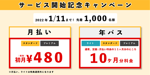 またそれに伴い、同日より1,000名限定のサービス開始記念キャンペーンを実施いたします。月額制はスタンダード・プレミアムプランが初月480円、年パスは全プランが1ヶ月分割引きとなります。なおアプリのダウンロード、施設予約・利用開始は2022年1月12日(水)を予定しております。