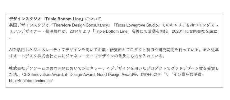 ジェネレーティブデザインを中心にプロダクト設計を手掛けるデザインスタジオ・合同会社Triple Bottom Line(本社:東京都杉並区、代表:柳澤 郷司、以下:Triple Bottom Line)は、2023年2月7日からストックホルムデザインウィークの一環として開催される『Stockholm Furniture Fair 2023』(以下、ストックホルム国際家具見本市)に招聘され、持続可能性を追求した新作照明プロダクト「ALVIS」(アルビス)を展示します。