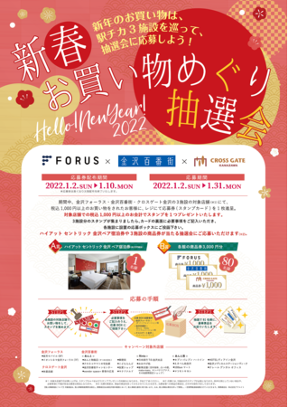 金沢フォーラス(株式会社OPA)・金沢百番街(金沢ターミナル開発株式会社)・クロスゲート金沢(オリックス不動産株式会社)の金沢駅前3商業施設では、金沢駅前地区の賑わいづくりに向けて手を組み、初となる合同企画として、2022年1月2日(日)から1月31日(月)まで、新年のお買い物で駅前3施設をご利用のお客さまにご参加いただけるスタンプラリー形式の抽選会を開催いたします。ぜひ新年のお買い物とあわせてお楽しみください。
