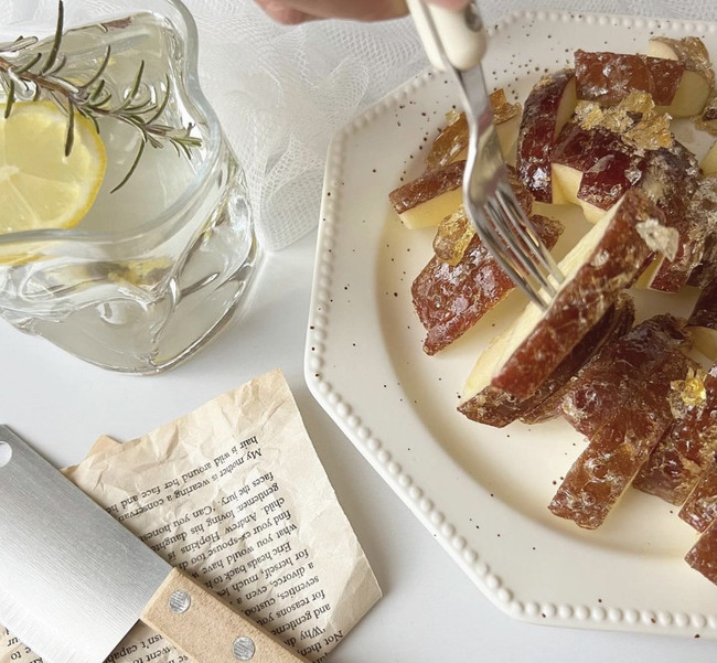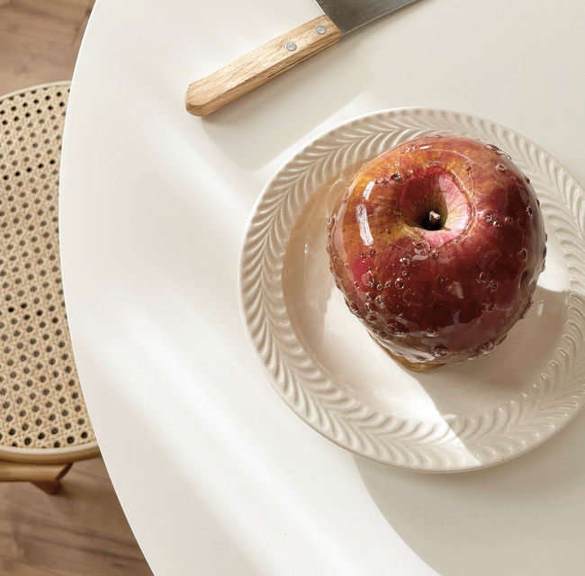 りんごの風味によって甘く濃厚な飴でりんごとの相性もバッチリです。一口サイズにカットしてお召し上がりいただくため、薄く飴をつけることではがれにくく、表面はパリパリとした食感と甘みをりんごと一緒にお楽しみいただけます。