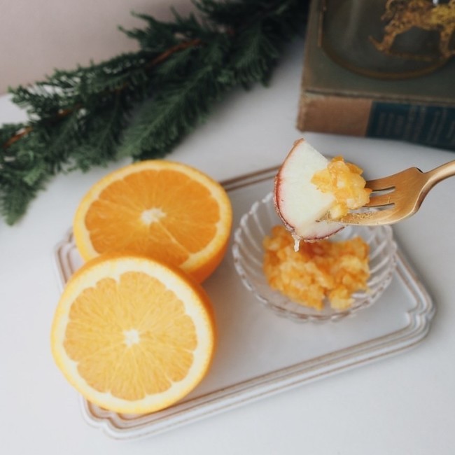 一口サイズにカットしたりんご飴をディップして、味の変化を楽しめる『オレンジピール』と『レモンピール』の2種類のディップフルーツをセット。