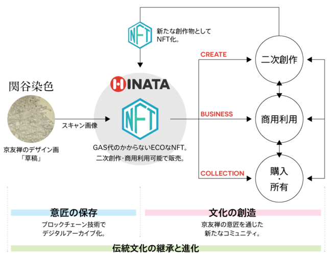 HINATAは、京都・洛中で120年以上、京友禅を受け継いできた「※株式会社 関谷染色」とともに、同社が所蔵する京友禅のデザイン画である「草稿」の画像をNFT化し世界に発信します。