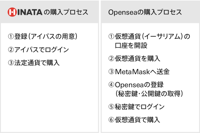 以下は、海外の代表的なNFTプラットフォームであるOpenSea(パブリックチェーン)との、購入プロセスの違いです。