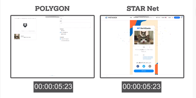 STAR NetはNFTの作成(無料)やNFTマーケットプレイスの作成(無料)をご提供しておりますが、NFT作成にはPOLYGONの約3分の1の時間での処理の速さに大変ご好評をいただいております。