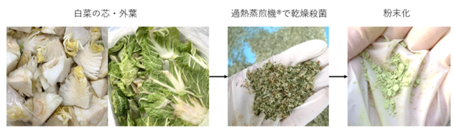 ある大手食品メーカーとの試作テストでは、白菜のざんさとなっている芯と外葉は、過熱蒸煎機で乾燥後、煮出すことでうま味の強い出汁が取れることがわかりました。現状は多額のコストをかけて産業廃棄物として棄てていた白菜のざんさを用いて、他の過熱蒸煎パウダーと組み合わせた野菜出汁の開発が進められています。
