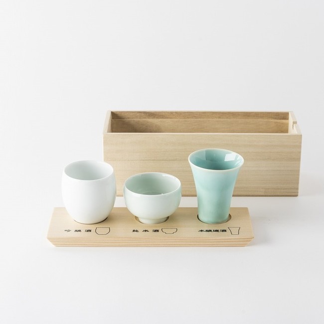 波佐見焼窯元「長十郎窯」による、酒器の形状によって味わいが変化する日本酒の特徴を楽しめる器。吟醸酒・純米酒・本醸造酒の3タイプの種類にあった器での飲み比べや、同じ酒を3種の形状で比べてみるのも面白い。AKOMEYA TOKYO別注カラー。