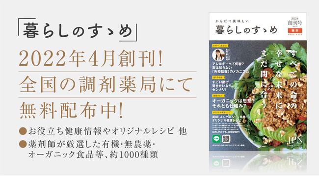 全国(沖縄を除く)の調剤薬局、約1,000店舗と業務提携※1し、JPNサービスの紹介・カタログ「暮らしのすゝめ」の配布※2・公式LINEでの健康レシピ配信を、薬局店頭にて2022年4月1日よりスタートしました。