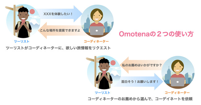 「Omotena」は、〈日本のローカルをもっと楽しもう〉をキャッチフレーズに、国内外の旅行者と、そのエリアをよく知る地元の人たちのご縁をつなぐローカルヘルプ・マッチングサービスです。旅行者は「Omotena」アプリを使い、エリア、カテゴリなどを選択し、欲しい旅情報をリクエスト投稿するだけで、そのエリアをよく知る旅先案内人、通称「ローカル・コーディネーター」(登録制)から、地元目線での旅のアドバイスや「今」の情報を入手することができます。