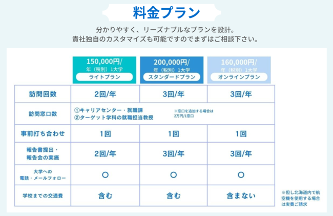 全国のエキスパートのネットワークを活用することで、1大学2窓口に対し年3回訪問で20万円のプランなど、