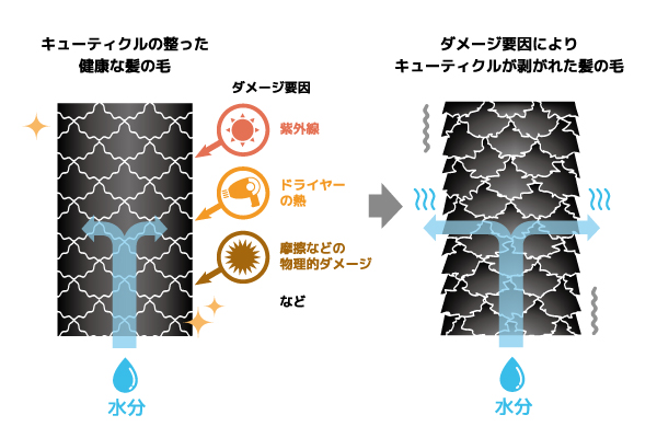 キューティクルが傷んで剥がれたり削れたりすると、なめらかさ・指通り・ツヤが損なわれるとともに、傷みが進みやすくなります。紫外線、汗や皮脂による汚れなどでダメージを受けた髪のキューティクルを集中的に補修し、若々しい印象の健やかな髪へ導きます。