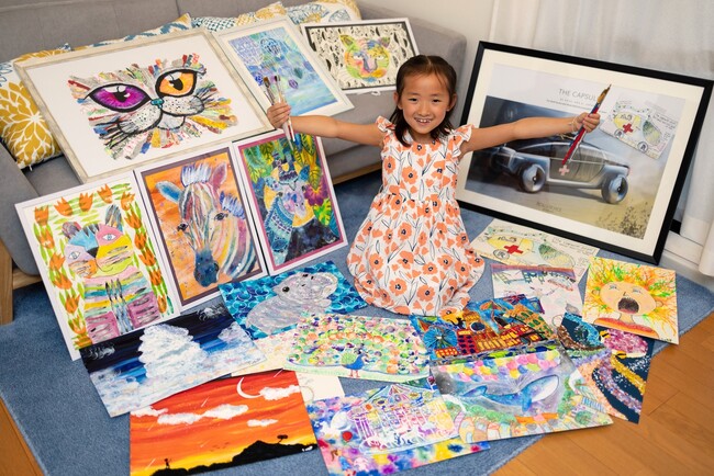 今年8歳になったSayaの作品は豊かな色彩と発想に満ち、見る人を喜びと発見に誘います。国内外の絵画コンクールで9つの賞を受賞し、SNSで話題となったほか、メディアにも取り上げられ多くの人を笑顔にしました。 Sayaの絵は学童用の画用紙に描かれています。高価な絵の具や特別な画材、キャンバスは使わず、一般的なクレヨンや絵の具を使っています。時には風船や洗剤といった、思わぬ画材を使うことも。全ての絵を家で描いています。