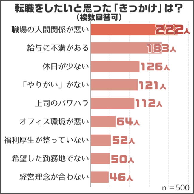 次に転職をしたいと思った「きっかけ」を尋ねてみると、第1位が「人間関係」でした。転職には至っていなくても、この結果に賛同する方は多いのではないでしょうか?