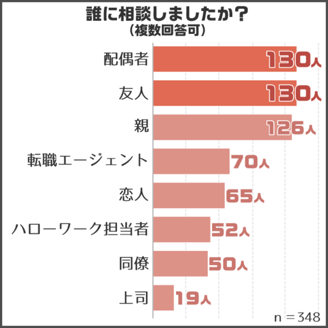 「誰に相談しましたか?」という問いに対しては、複数回答で「配偶者」「友人」「親」が1位・2位・3位で、ほぼ同着です。