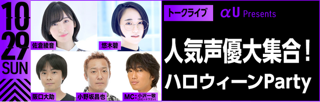 声優ならではのトークやオリジナルゲーム、さらに「αU metaverse」の街に繰り出してファンと会話や記念撮影を行うなど、バーチャルならではの交流イベントが盛り沢山。ここでしか見られない特別なパーティーをお見逃しなく!
