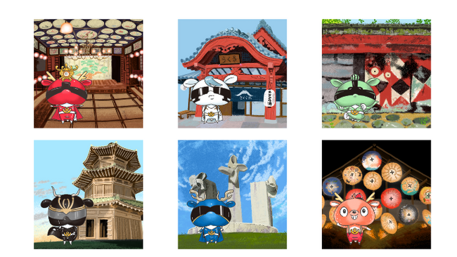 このたび、山鹿市の各名所とキャラクターを組み合わせた全100種類、全100個のNFTが制作され、ANAグループのNFTマーケットプレイス『ANA GranWhale NFT MarketPlace』にて販売することとなりました。