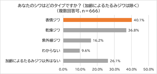 続いて、「顔のシワが気になる」と回答した人に「そのシワのタイプ(加齢によるたるみジワは除く)」を尋ねまたところ、「表情ジワ(40.1%)が最多、以下「乾燥ジワ」(36.8%)、「紫外線ジワ」(16.2%)と続きました。