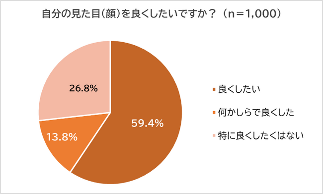 「見た目(顔)を良くしたいか?」尋ねたところ、6割(59.4%)が「良くしたい」と最多で、「特に良くしたくはない(以下、良くしたくはない)」は3割弱(26.8%)、「何かしらで良くした(以下、良くした)」も1割超(13.8%)いました。