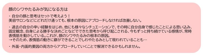 「フェイシャルレメディ(R)」という手技で顔(表情筋)を触ると、その人が常に持っている感情や考え方(顕在意識)が大体わかります。例えば、ネガティブな感情が起きているとできてしまうシワや顔のトラブルは、ボトックスやヒアルロン酸注射を打てば、一瞬で改善することができます。しかし、そのシワの原因は、筋肉の動かし方。ネガティブ思考でいると、表情筋が常に間違ったエクササイズをしてしまうからです。顔は感情で鍛えられているため、感情や思考によって、シワできたり、逆にハリができたりするのです。