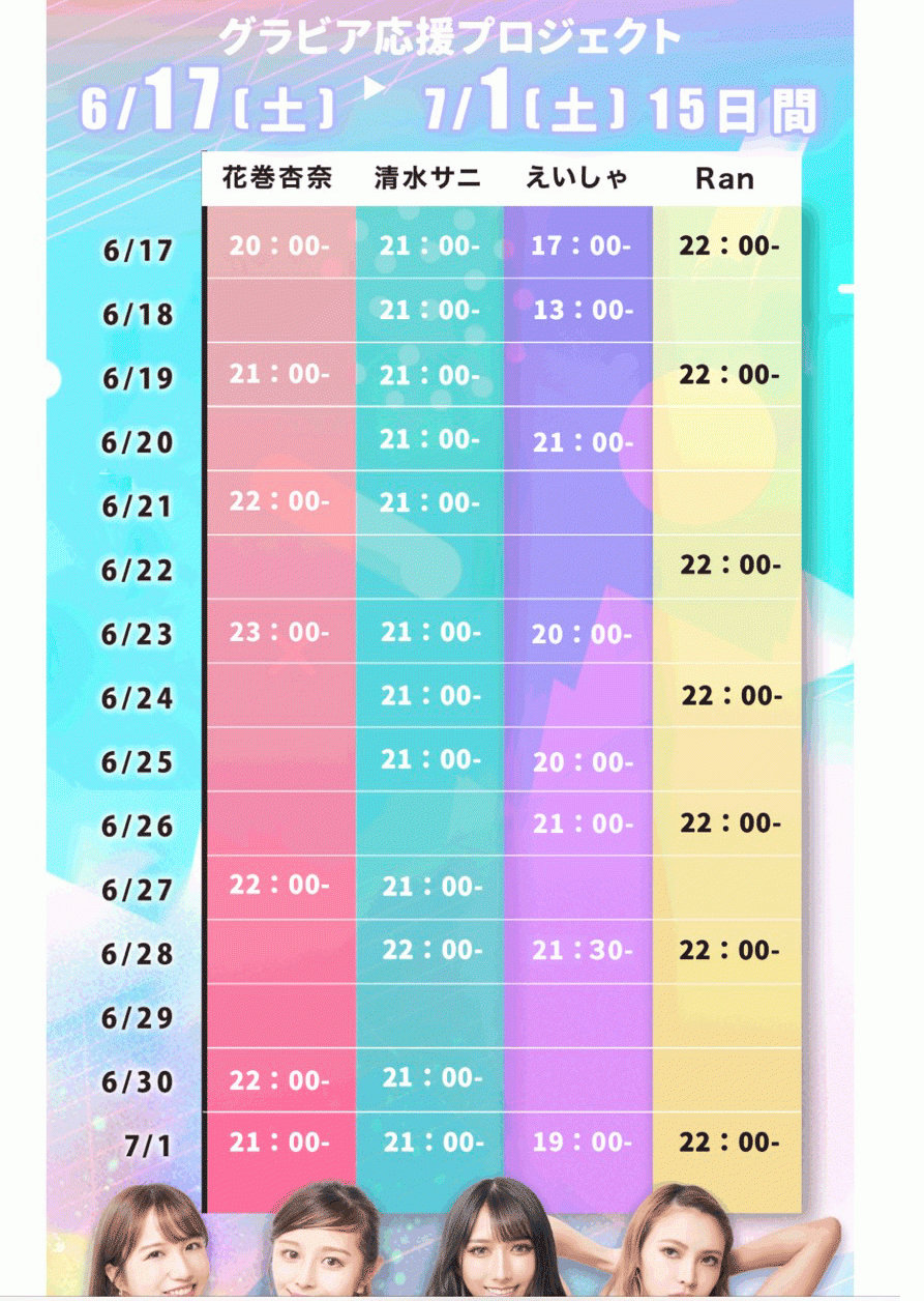 プラチナムプロダクション所属のRan(らん)、花巻杏奈(はなまきあんな)、犬嶋英沙(いぬしまえいしゃ)、清水サニ(しみずさに)の4名が写真集のページ数を賭けてしのぎを削り、ライブ配信アプリ「FunVita」上で大混戦状態になっております。