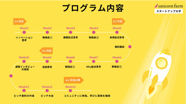 ユニコーンファームは2017年の創業以来、これまでの数多くのスタートアップ/新規事業のメンタリング実施の経験から、多くの起業家/起業志望の方が、そもそもの考え方・意識や基礎知識不足により事業を推進できないことを発見しました。そこで日本のスタートアップ・エコシステムの成長のためには、徹底的に基礎を学べる入門プログラムが必要と感じ、この講座を企画いたしました。