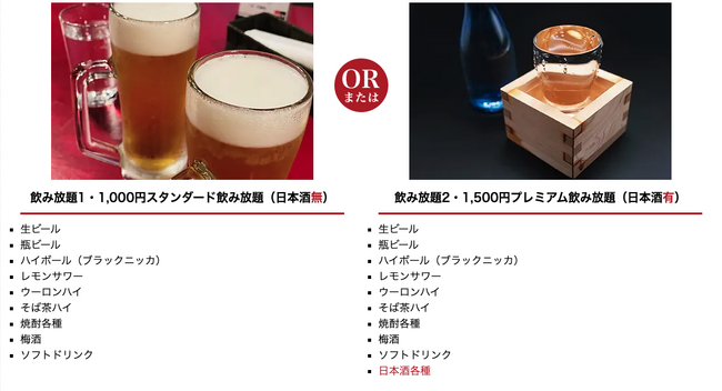 飲み放題2・1,500円プレミアム飲み放題(日本酒有)
