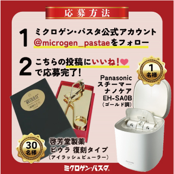 啓芳堂製薬では、Instagramでミクロゲン・パスタ公式アカウントを開設し、ストリートスナップで撮影した”街ゆくすてきな女性”をご紹介しています。この度、「いつまでも美しいジブン」を追求する皆様を応援するために、Instagram公式アカウント(@microgen_pastae https://www.instagram.com/microgen_pastae/)をフォロー、いいねをしていただいた方に、抽選でPanasonicナノケアスチーマー(1名様)、啓芳堂製薬復刻版アイラッシュカーラー「ビウラ」(30名様)をプレゼントいたします。