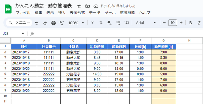 出退勤データはリアルタイムでGoogleスプレッドシート上に蓄積され、勤怠管理表が自動で作成されます。これにより、タイムカードの転記作業や勤務時間の集計作業も一切不要になります。