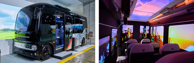 コンテンツ体験バスで、車両の位置情報に合わせて、モニターや透明ディスプレイ、天井にコンテンツが再生され、車窓の景色に連動したVR/AR体験を提供します。