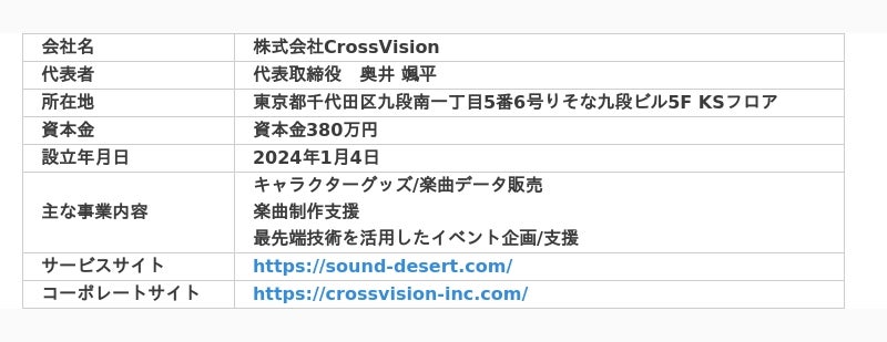 クロスビジョンの代表取締役社長にはドコモ社員の奥井 颯平が就任しており、web3技術を活用しVTuberを中心としたクリエイターのデジタルコンテンツを企画から制作、販売までトータルで支援する「Sound Desert」(読み:サウンド・デザート)事業を2024年6月1日(土曜)より開始します。