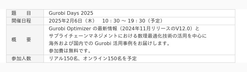 - 2025年2月開催の詳細 ?https://www.gurobi.com/jp_events/gurobi-days-2025/