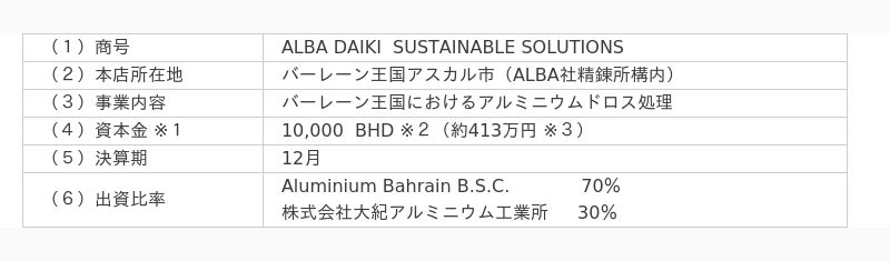 当社は、バーレーン王国に本社を置く世界大手のアルミニウム精錬会社であるAluminium Bahrain B.S.C.(以下、「ALBA社」)との間で、合弁会社設立に関する合弁契約を締結いたしましたので、下記のとおりお知らせいたします。