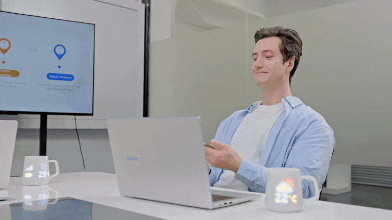 デスクでコーヒーを淹れた瞬間、今日の天気がマグに表示される。「あ、雨マーク。傘を持っていこう」とスマホを開く手間なく準備ができます。忙しい朝の時短にも貢献します。