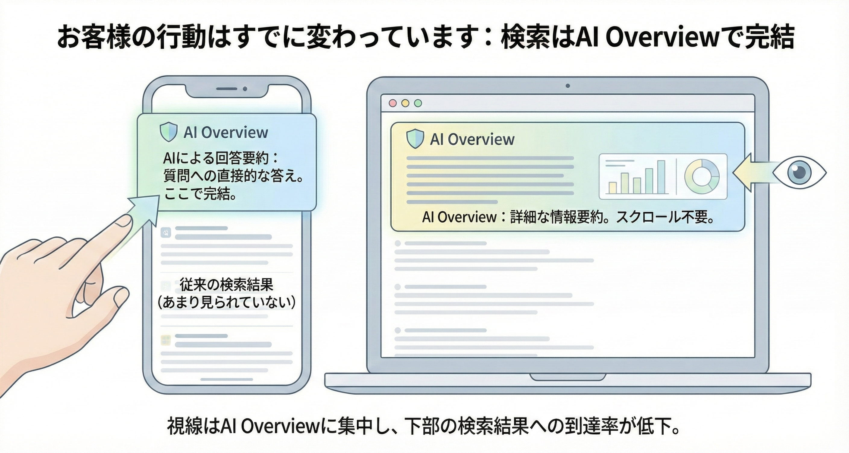 ・ゼロクリック検索 (Zero-Click Search): 検索エンジンの結果画面にAIによる回答や要約が表示されることで、ユーザーがWebサイトのリンクをクリックせずに検索行動を終えてしまう現象のこと 。