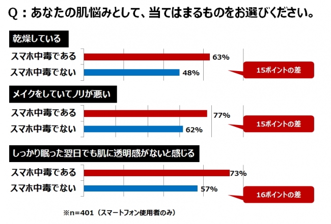 前問のスマホ中毒である回答者とスマホ中毒ではない回答者に、肌悩みに関して質問しました。「スマホ中毒」を自覚している人ほど、肌力が低下して肌の乾燥やくすみなどといった悩みが多い結果が得られました(グラフ2)。このことから「スマホ中毒」ほど、肌力が低下した状態である「スマホ下がり肌」になっていることが分かりました。