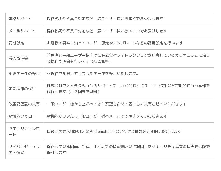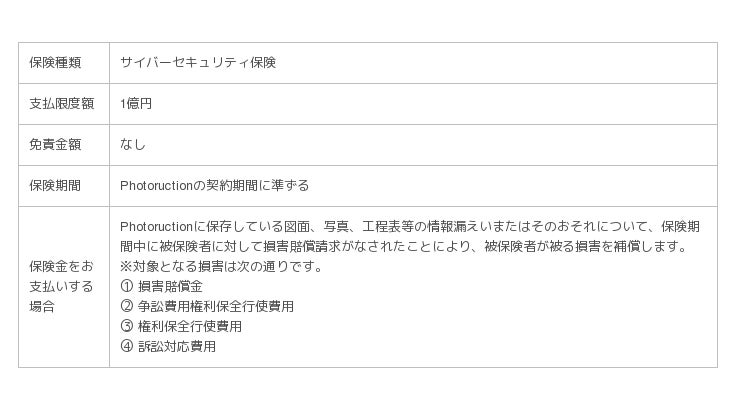 そこで今回、セキュリティに関する新たな取り組みとして、サイバーセキュリティ保険を付帯した「安心サポートプラン」をあいおいニッセイ同和損保と共同で開発しました。Photoructionに保存されている図面、写真、工程表等の情報漏えいに起因したセキュリティ事故が発生した場合に生じる、顧客・第三者に与えた被害に対する損害賠償を補填するオリジナル損害保険商品となります。