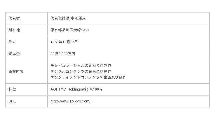 AOI Pro.は、広告映像制作をコアビジネスとするアジアトップクラスの映像プロダクションで、年間約1,000本の広告映像を制作しており、企画、演出、プロデュース、3DCG制作、最新機材、撮影スタジオなど映像に必要なリソースをグループ内に備えています。