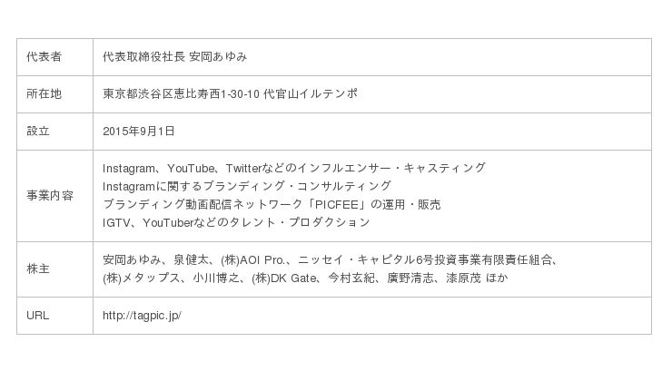 株式会社AOI Pro.(本社:東京都品川区、代表取締役:中江康人、以下AOI Pro.)は、アジア最大級のインフルエンサー・マーケティング企業であるタグピク株式会社(本社:東京都渋谷区、代表取締役社長:安岡あゆみ、以下タグピク)と、本日付で資本業務提携契約を締結いたしました。