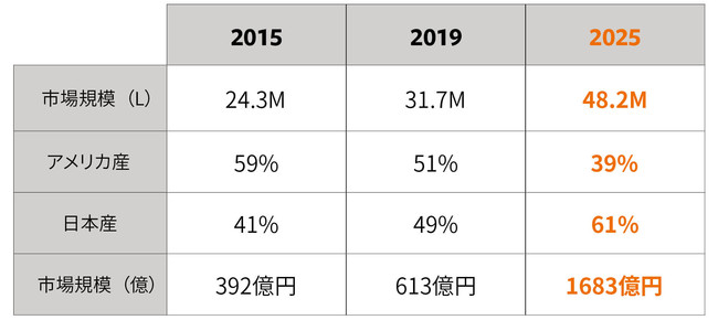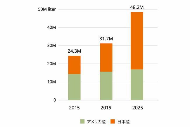 アメリカのミレニアル層(1981〜1996年生まれ=現在20代後半〜30代)は、学生時代からインスタントラーメンやカリフォルニアロール、HOT SAKEなどの日本生まれのカルチャーに慣れ親しんだ世代です。いまや、都市部では1杯2000円以上するラーメンに行列ができ、KAISEKI(懐石)やOMAKASE(おまかせ)は食通にとっての重要なキーワードになっています。その影響から、日本酒市場はここ10年近く二桁成長を続けており、このまま伸びれば、数年後には日本産の日本酒がアメリカの現地生産清酒を抜き、2025年には1600億円規模の市場になると予測されます。