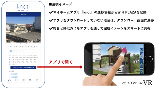 今回のサービス連携では、安心計画が提供するユーザー向けには家の完成イメージをCG・VRモードで自宅に居ながらご覧いただけるアプリ「ウォークインホーム+VR」とマイホームアプリ「knot」を繋ぐ機能を実装。「knot」上でメッセージと合わせて「ウォークインホーム+VR」のご案内をすることで、より効率的かつ確実にユーザーへリーチすることができます。