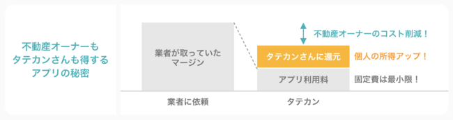 「タテカン」のサービスは、建物管理業界で働く人にとって何が求められているのか、どのようなシステムがあれば働く人にとってより良い環境を提供出来るかを第一に考え、創りだされました。建物管理を総合建物管理会社に依頼した場合、一つの依頼に対し複数の関係者が介在することになるため介在する中間業者の数だけ中間マージン(中抜き)が発生し、その結果報酬が高額になってしまいます。しかし、報酬が高額にも関わらず、実際に手を動かした働く人の所得は少ないのが現状です。「タテカン」は従来の中間業者を介在させる形式とは異なり、不動産オーナーと建物関連スキルを持つ個人が直接マッチングすることが出来るため複数業者分発生していた中間マージン(中抜き)が発生しません。不要な中間マージン(中抜き)を省くことにより新たに生まれる利益をタテカンさんに適正報酬で配分し、「タテカン」により研修・資格補助制度をタテカンさんに提供することで、不動産業界全体のスキルアップと所得アップの両方の実現を目指します。