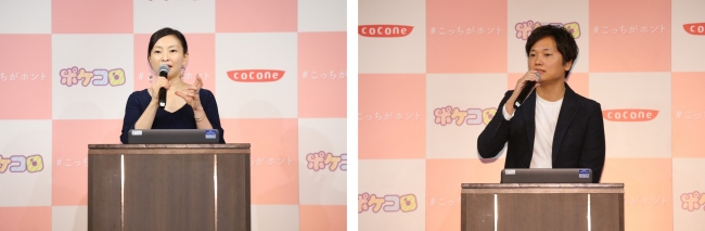 発表会当日は、ココネ株式会社 取締役 石渡 真維が挨拶を行った後、マーケティング室 室長 佐野 孝行より、8周年を迎えた『ポケコロ』のサービスの紹介と共に、2019年9月に実施した“ホントの自分”を出せずにいる女性「着ぐるみ女子」の実態調査と、この調査結果をもとに展開する今回の「#こっちがホント」キャンぺーンについて説明がありました。「“よそいきの自分”と“ホントの自分”、そんなどちらの自分も受け入れながらバランスをとっている女性たちを応援するとともに、ポケコロが、?ホントの自分“を楽しめる場所でありたいという思いを込めて本キャンペーンを企画しました。」とコメント。「11月からは新たにキャンペーンの広告キャラクターを起用し、今回のキャンペーンをさらに盛り上げていきます。特にママ編の広告を世の中の男性陣にも注目して見てほしい。」と今後について語りました。