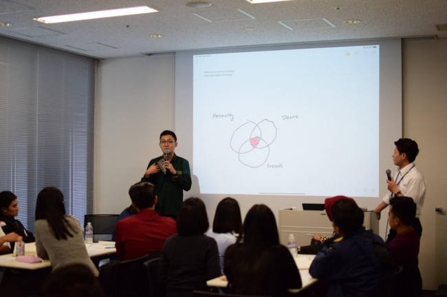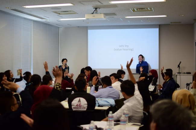当日は11カ国、32名の参加者に対し、弊社代表取締役である高橋秀成がファシリテーターとなり、ディーセント・ワークの説明から、日本の労働環境の現状を「過労死・セクシャルマイノリティへの差別・子育てと労働問題」等の観点から伝え、普段のキャリアカウンセリングで行っているヒアリングの一部を青年達に行い、個々の価値観の違いと、それぞれを認め合う重要性を体感して頂きました。