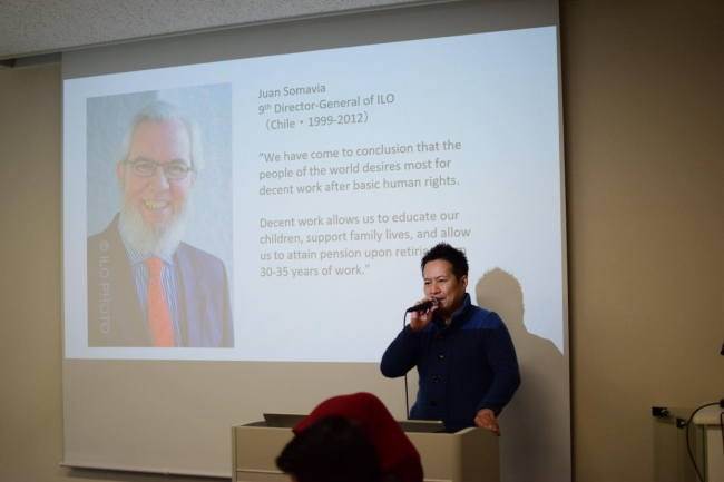 グループディスカッションでは、各々が考える「ディーセント・ワーク」をブレストし、各自がどう実現していくかをそれぞれ発表して頂きました。