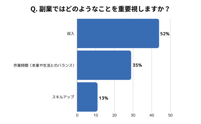収入が52%と半数以上の方が収入を気にしており、次いで副業のあてる時間(生活や本業とのバランス)が35%、スキルアップは13%という結果となりました。