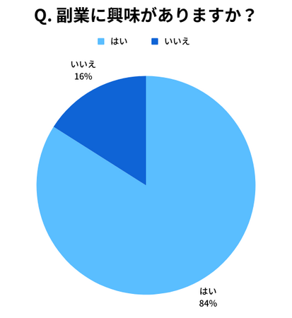 「副業に興味がありますか?」という問いに「はい」と答えた人が84%。「いいえ」と答えた人が16%と、ほとんどの人が副業に興味があることがわかりました。