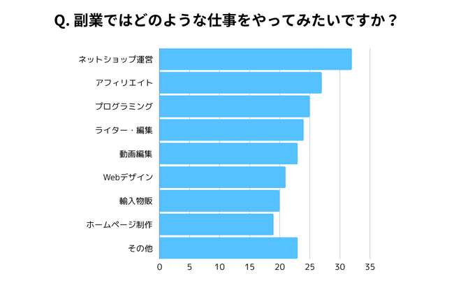 ネットショップ運営/30票、アフィリエイト/27票、プログラミング/25票、ライター・編集/24票、動画編集/23票、Webデザイン/21票、輸入物販/20票、ホームページ制作/19票、その他/23票