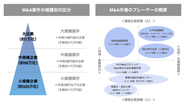 そんな後継者不足問題の解決策として、あるいは新たなキャリアの選択肢として、中小規模のM&Aが注目されています。しかし、既存のM&Aアドバイザリーサービスのビジネスモデルは大規模な案件を前提に作られており、ニーズが増えつつある中小規模のM&Aには専門家のアドバイスが行き届いていないのが現状です。