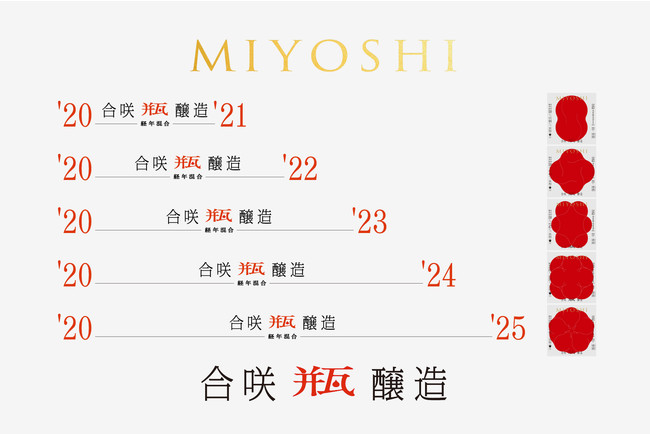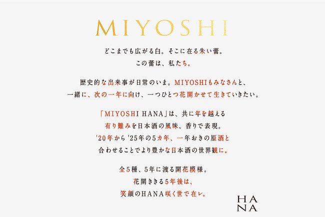 それぞれの業界が、ヒト・モノ・コトとの触れ合いに知恵を絞っている昨今。「日々ただ生きる のではなく、共に生き抜くこと が大切」だと語る6代目。「MIYOSHI HANA」は単なる新手法への挑戦のみならず、5ヵ年イヤーボトルのリリースを未来に宣言することで、日本酒業界でお世話になった同業種・飲食関係の皆様と生き抜く覚悟をベースに、お客様にとって“翌年の楽しみ”となるように、いち表現者として願いを込めた一品となっております。